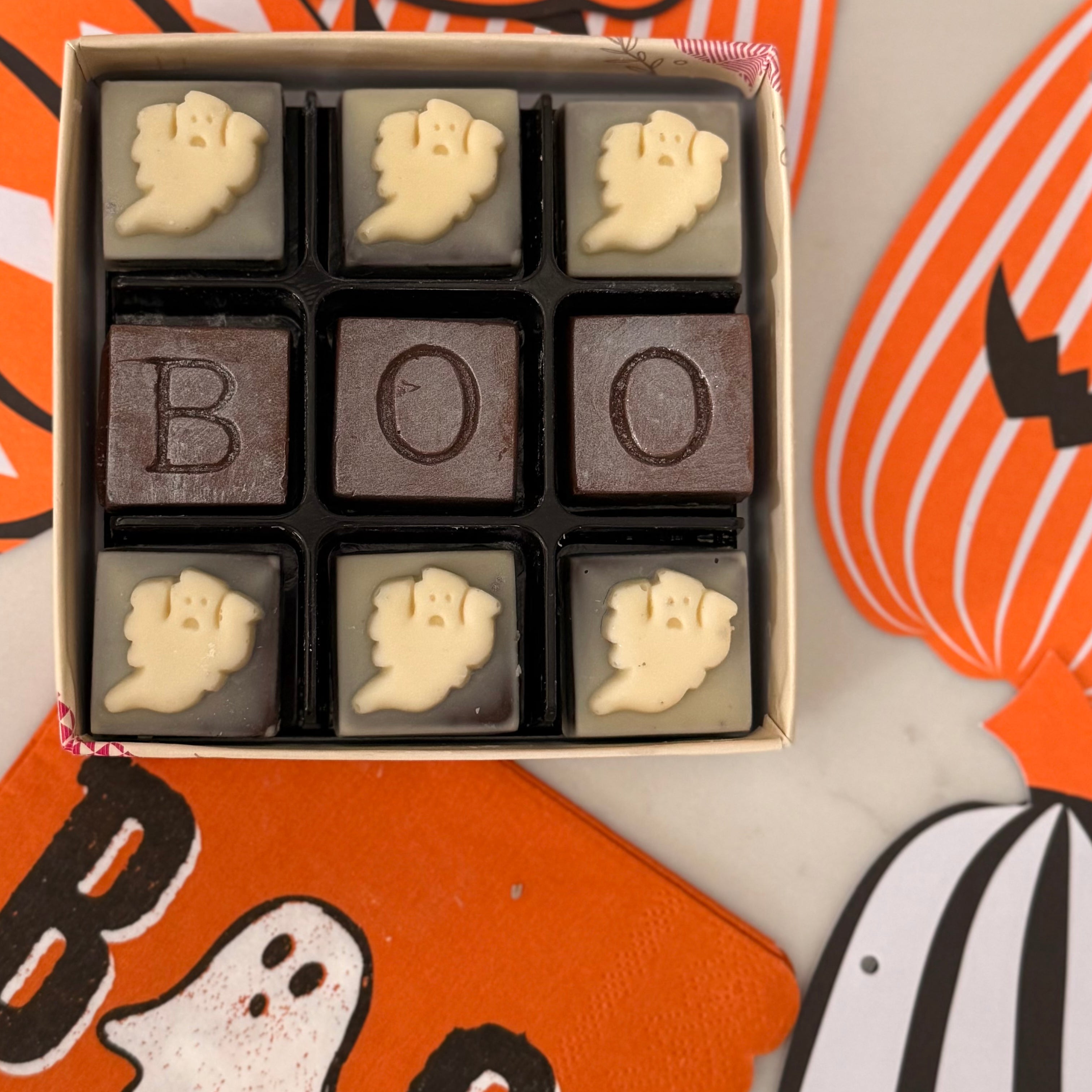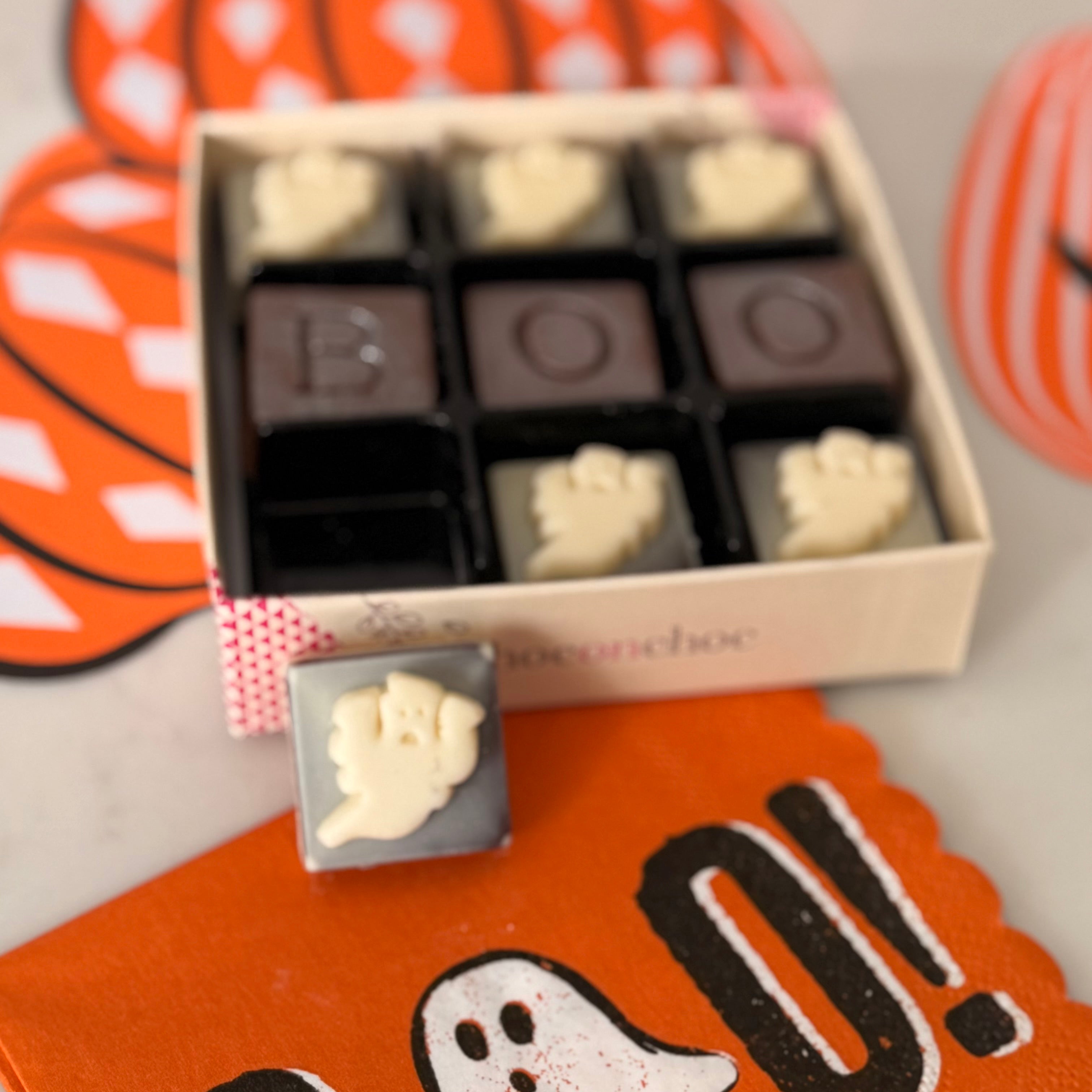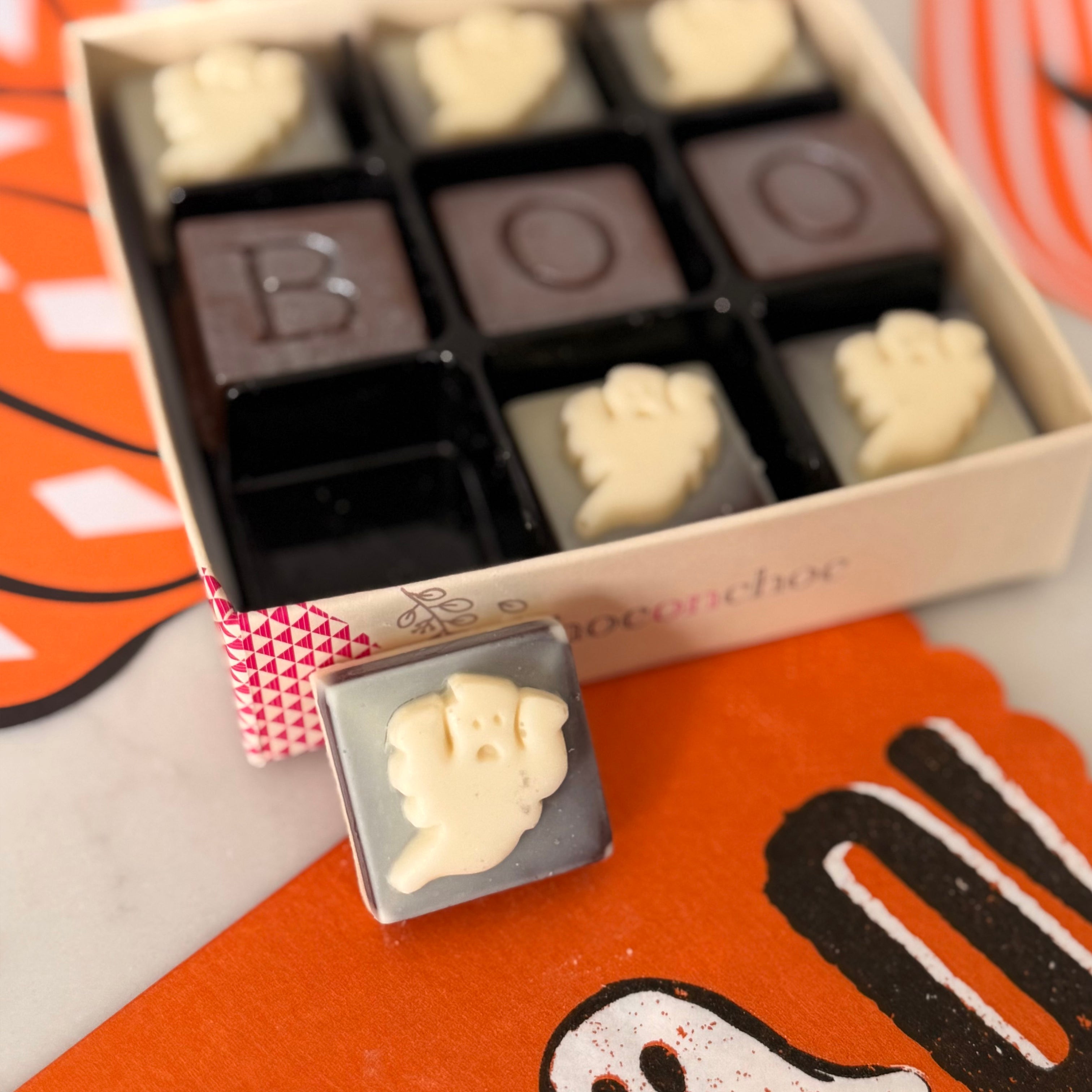 Indulge in the ultimate Halloween treat with our BOO Chocolate Box, expertly handcrafted in White & Dark Belgian chocolate, perfect for sharing with your little trick-or-treaters or savoring during a spooky movie night. Each bite offers rich, smooth flavours that capture the spirit of the season, making your celebrations even more memorable. Treat yourself and your loved ones to this irresistible assortment that combines festive fun with premium quality chocolate craftsmanship.