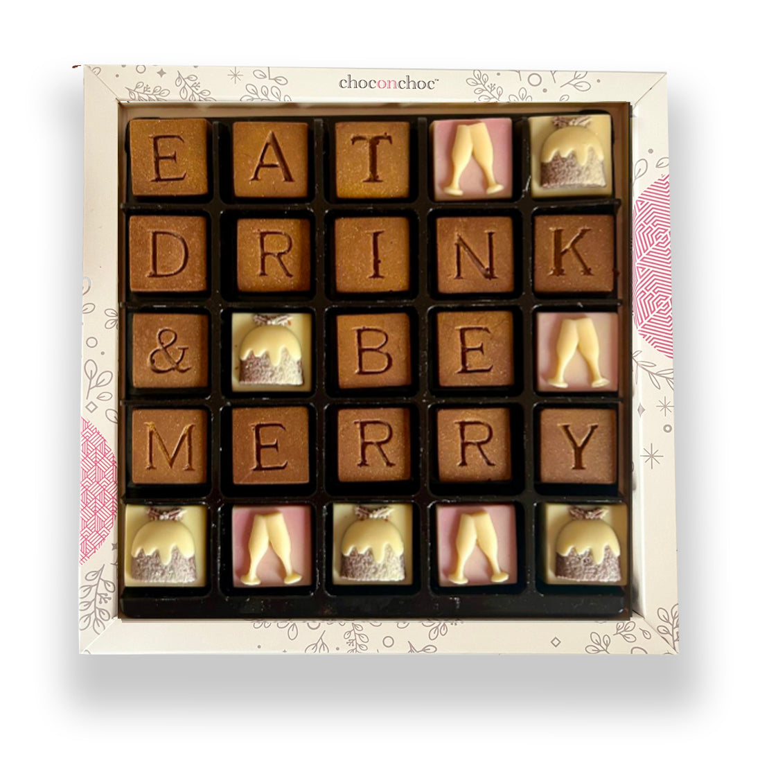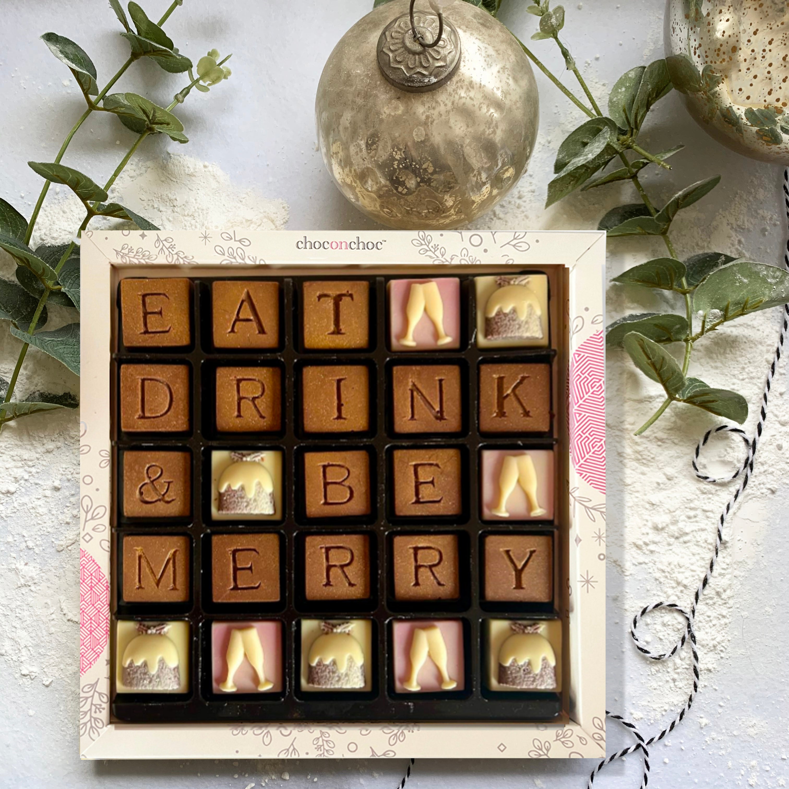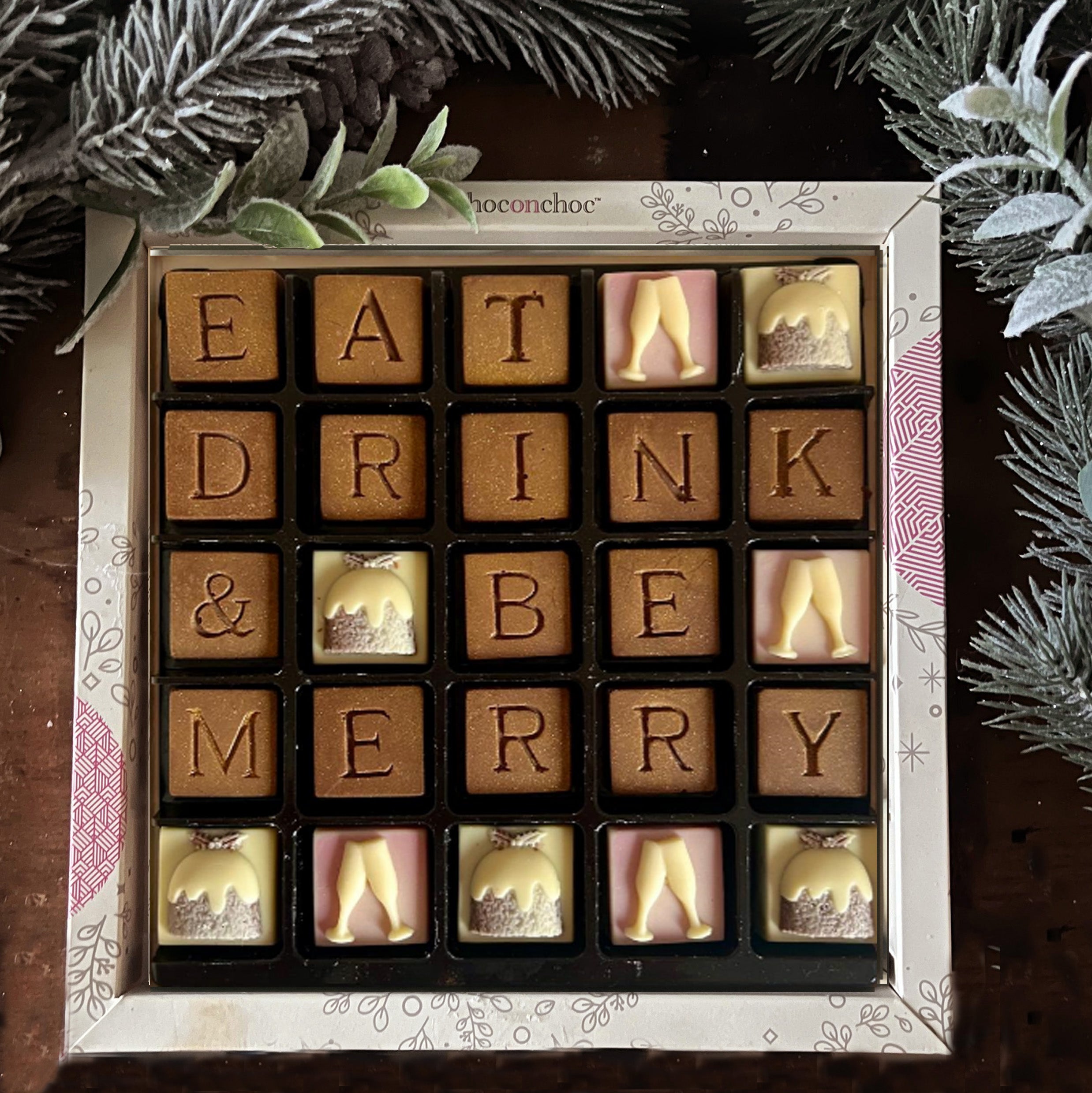 Elevate your festive celebrations with the Eat, Drink & Be Merry Chocolate Message Box, a delightful twist on our beloved chocolate selection. This box features elegant white chocolate Prosecco glasses, classic puddings, and richly smooth Belgian milk chocolate letters dusted in shimmering gold, spelling out ‘Eat, Drink & Be Merry’. Perfect for sharing on Christmas Eve, sparking joy at the office, or adding a luxurious surprise beneath the tree, this indulgent treat captures the spirit of the season and brings loved ones together in sweet celebration.
